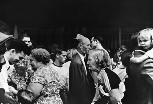 The style of photography demonstrated in The Americans de-prioritizes purely technical photographic manipulations in favor of careful organization of content. Plate 19, entitled “Canal Street,” (see above) is a perfect example of using a deliberately obfuscated subject in order to heighten the complexity of the image and create a richer overall experience for the viewer. At first glance, this image reads as a fairly straightforward lateral view of a busy sidewalk. There are a number of people in the image, most focused primarily straight ahead as they mingle in opposing directions. The image seems fairly benign and quotidian upon initial examination. However, any careful viewer will ultimately stumble upon the only individual in the image who is directly engaged with the camera. On the left of the frame, there is a caucasian man whose face is diagonally obscured by the man in front of him, but who is clearly eyeing the camera with what could variously be interpreted as apprehension, suspicion, or even anger. Regardless of how one interprets this man’s expression, it introduces a layer of tension into the scene that was previously absent. This forces us to reconsider the remaining people in the scene in a new light: now they are unaware (or deliberately ignoring) this new conflict in the frame. As we examine the rest of the scene, we may also see on the opposing side of the frame that an African American woman in the crowd whose face is obscured in almost an identical pattern to the upset man, visually connecting these two subjects. It also appears that she may be looking straight at him: the only one in the crowd who is aware of him and the new tension in the scene. Combined with the preceding plate (the famous Trolley shot, also taken in New Orleans, where the African Americans sit at the rear of the trolley), this image is highly suggestive of the racial tensions bubbling beneath the superficial crust of the American 50‘s. This image serves as an excellent example of the fact that an obscured subject can be a very effective means of layering interest in a photograph, because it makes the viewer dig deeper into an image, and it can also prompt a reevaluation of the more obvious subject matter once the real subject is discovered.